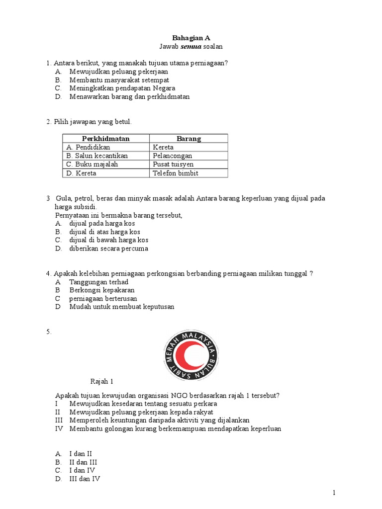 1 Antara berikut yang manakah benar tentang tujuan perniagaan a Mewujudkan peluang pekerjaan b Membantu masyarakat setempat c Meningkatkan pendapatan negara d Menawarkan barang dan perkhidmatan 2 Pernyataan manakah merupakan ciri kehendak manusia a Mudah dipenuhi b Hidup lebih selesa c. Sekali lagi Cikgu Donny ingin membantu rakan-rakan guru perniagaan bagi memudahkan pdpc kepa.